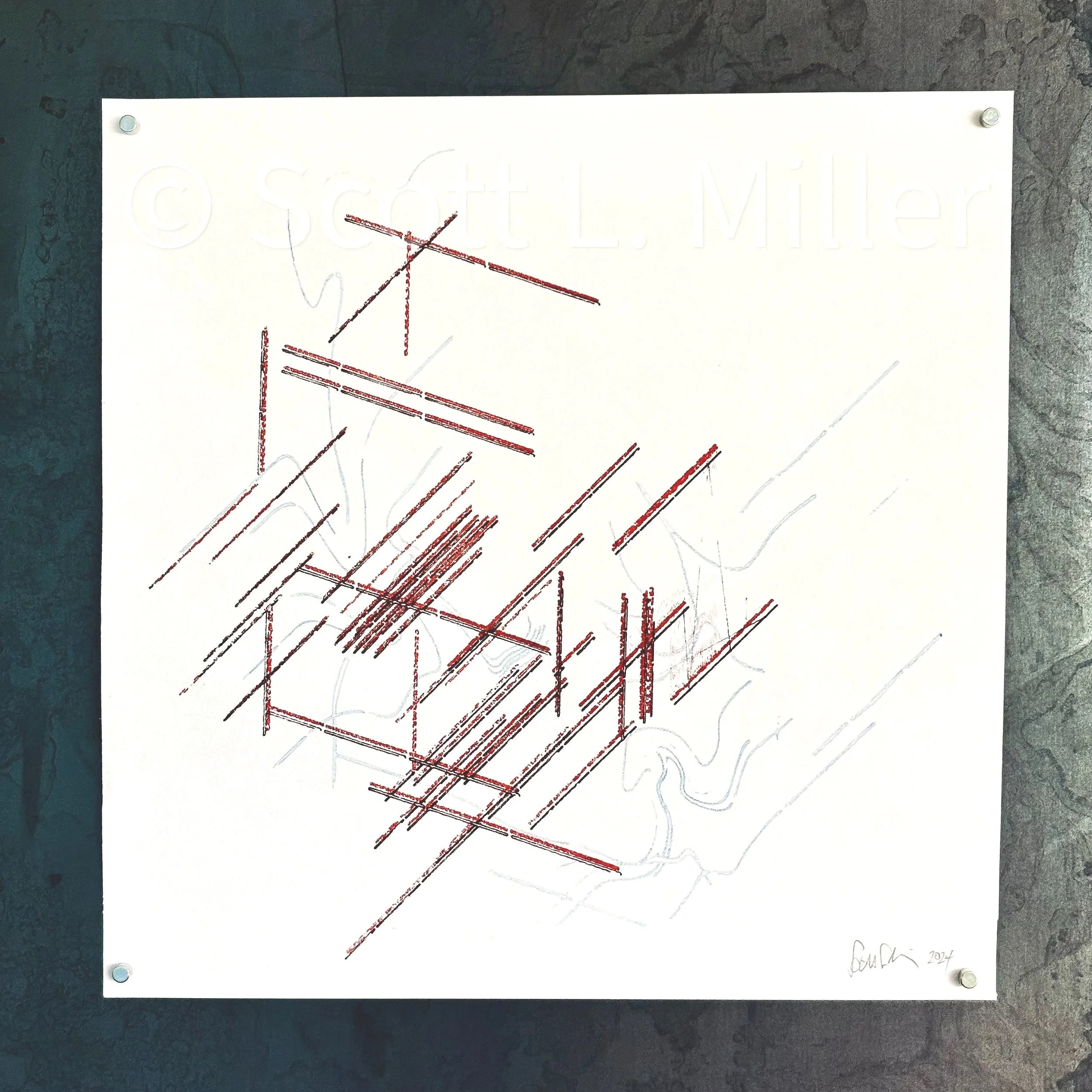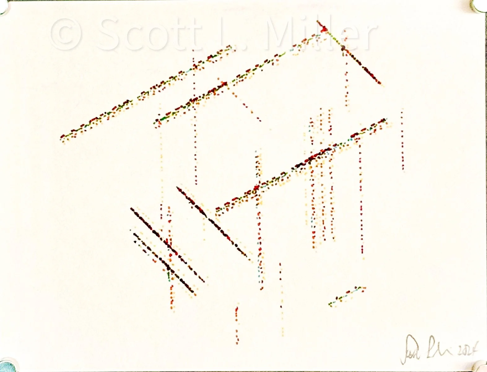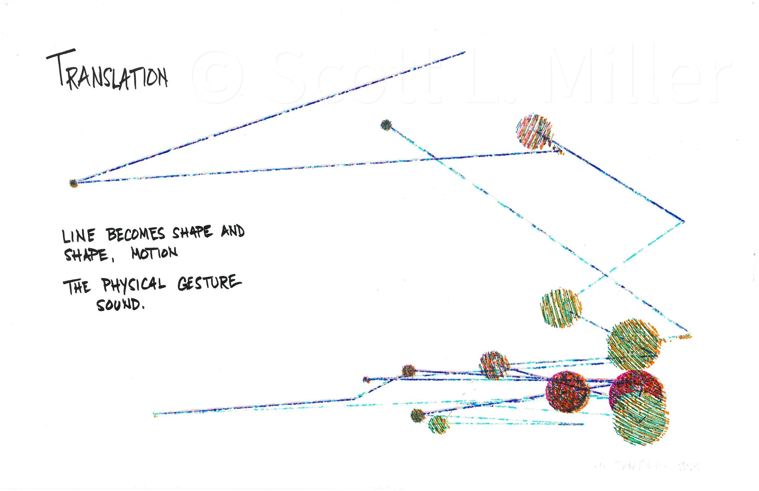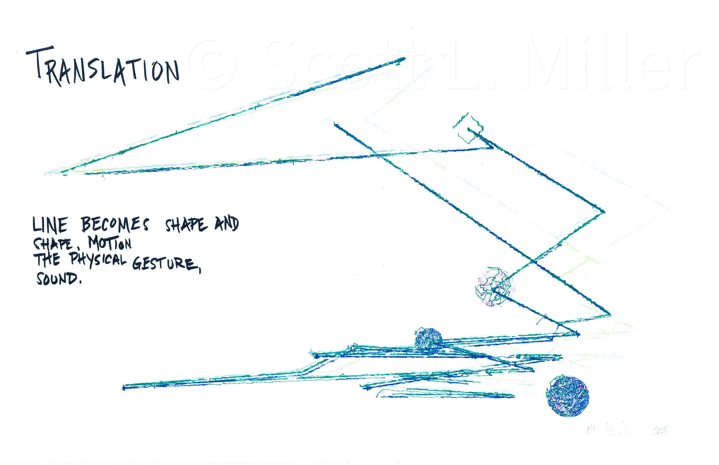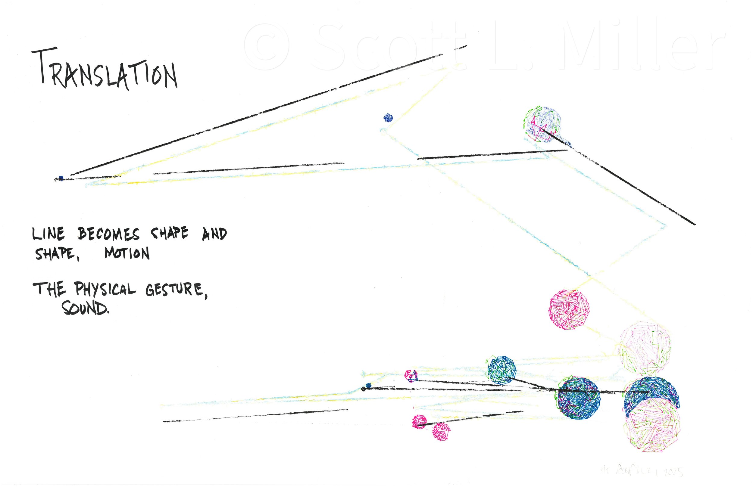 The “ground“ is the digital algorithmic process operating and the multiple iterations translating it; the “figure” is the surface that emerges from the ultimate physical and/or acoustic interpretation this translation. Translation—premiered by the percussion duo low pass in November 2025–is the most recent example. These are unique monoprint editions of the score and parts, produced with pen, pencil, and robotic drawing arm.