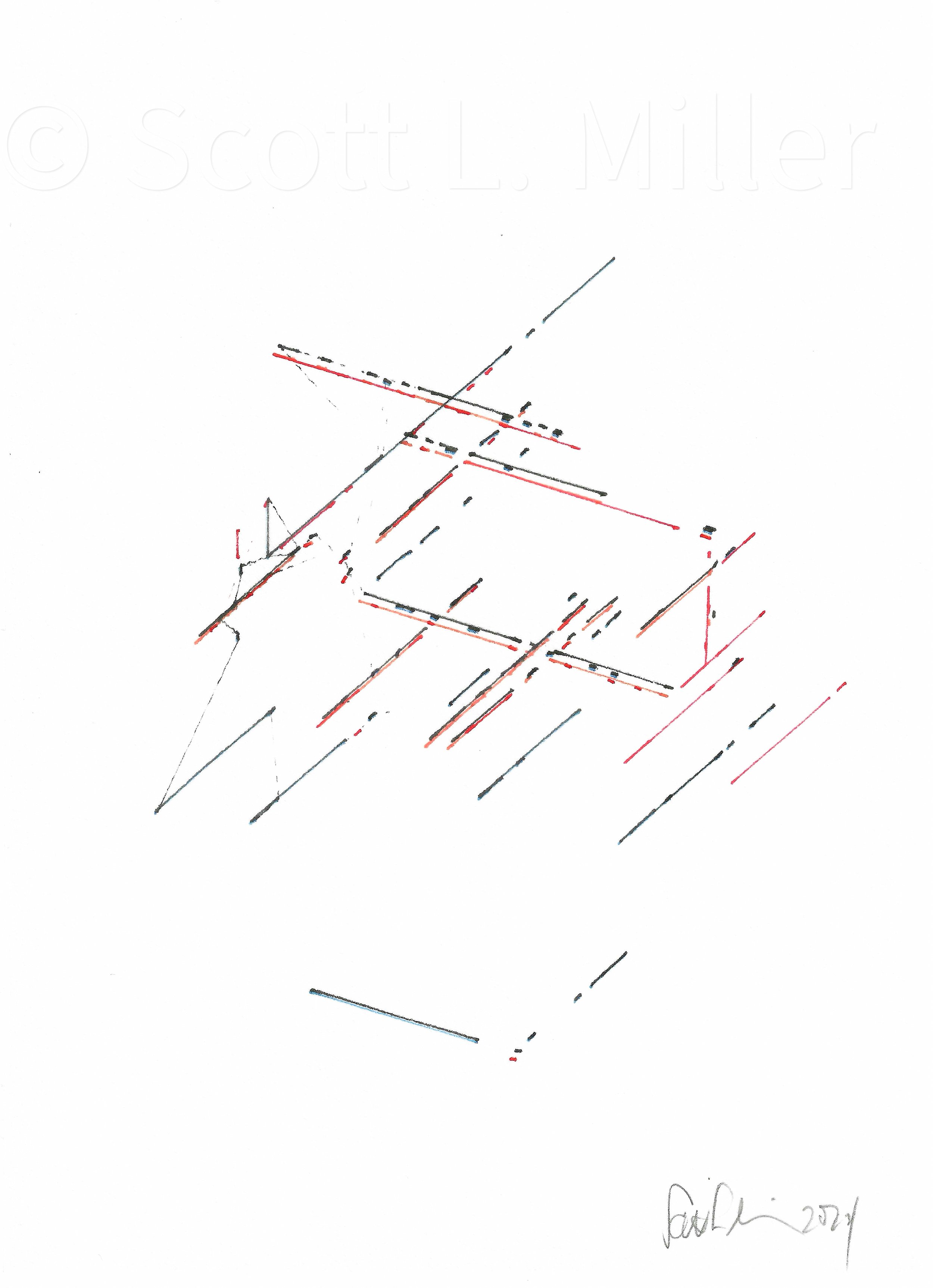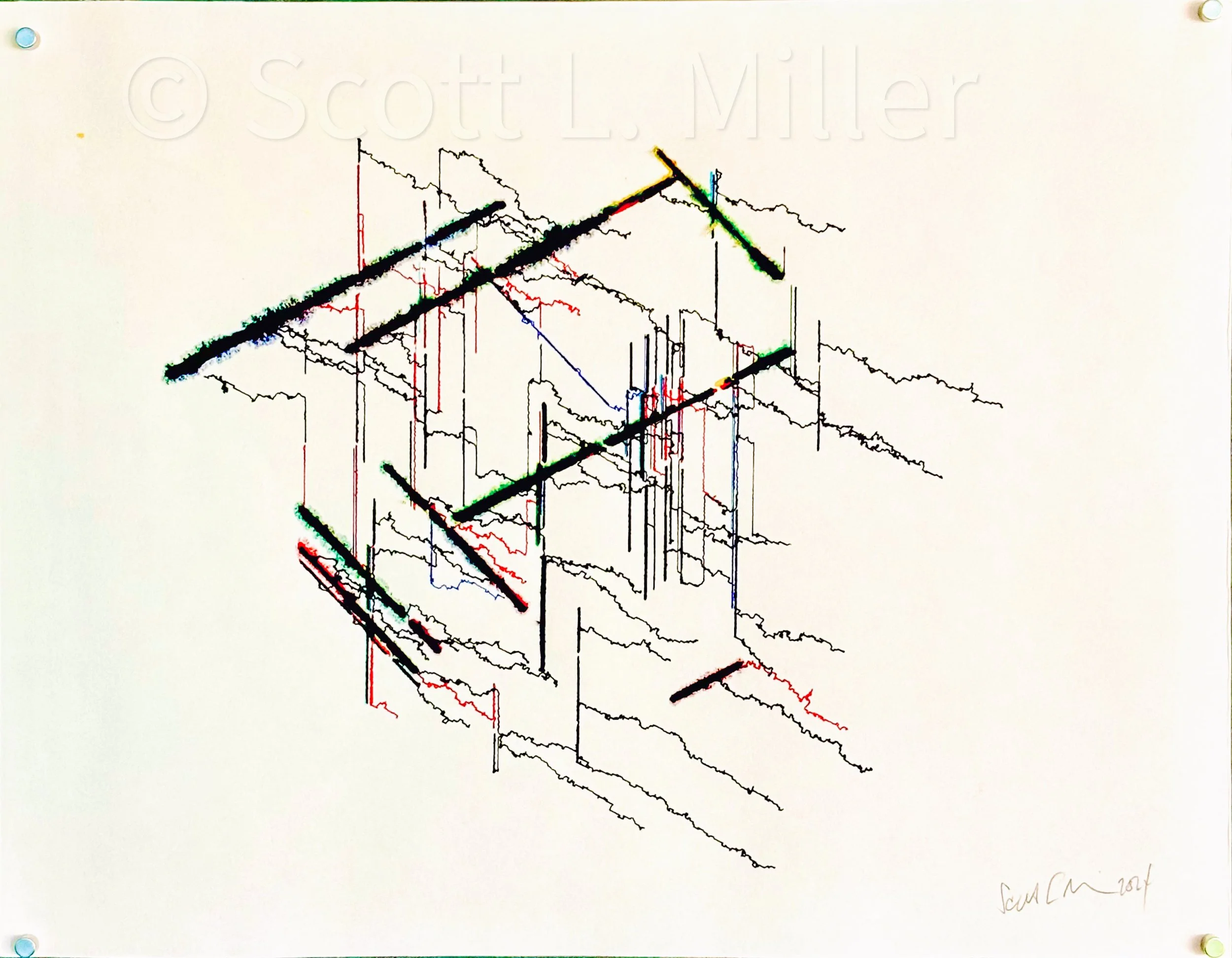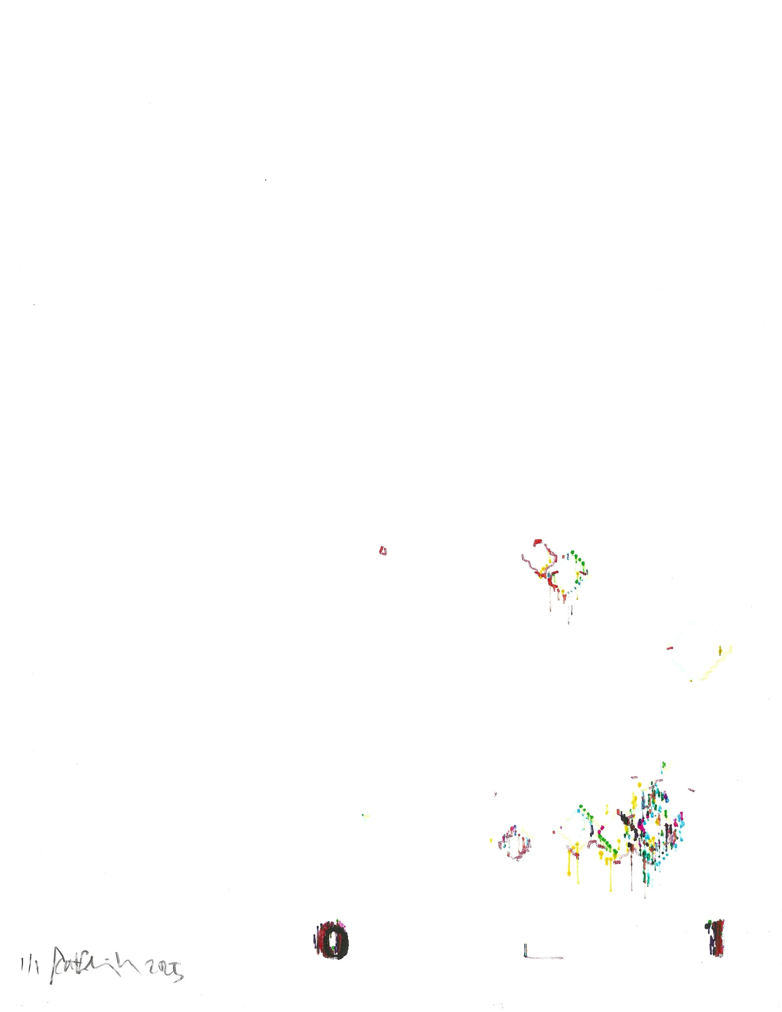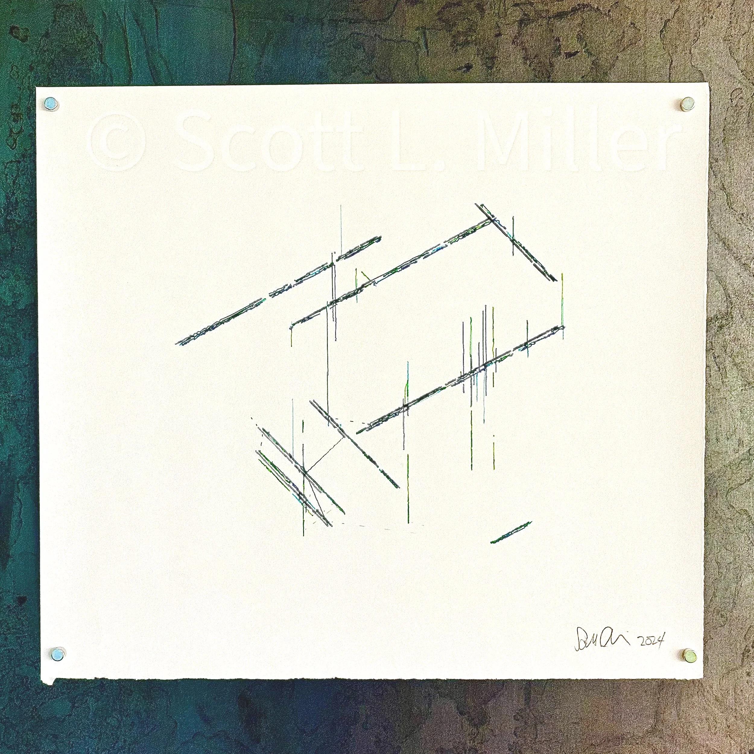 The “ground“ is the digital algorithmic process operating and the multiple iterations translating it; the “figure” is the surface that emerges from the ultimate physical and/or acoustic interpretation this translation. Translation—premiered by the percussion duo low pass in November 2025–is the most recent example. These are unique monoprint editions of the score and parts, produced with pen, pencil, and robotic drawing arm.