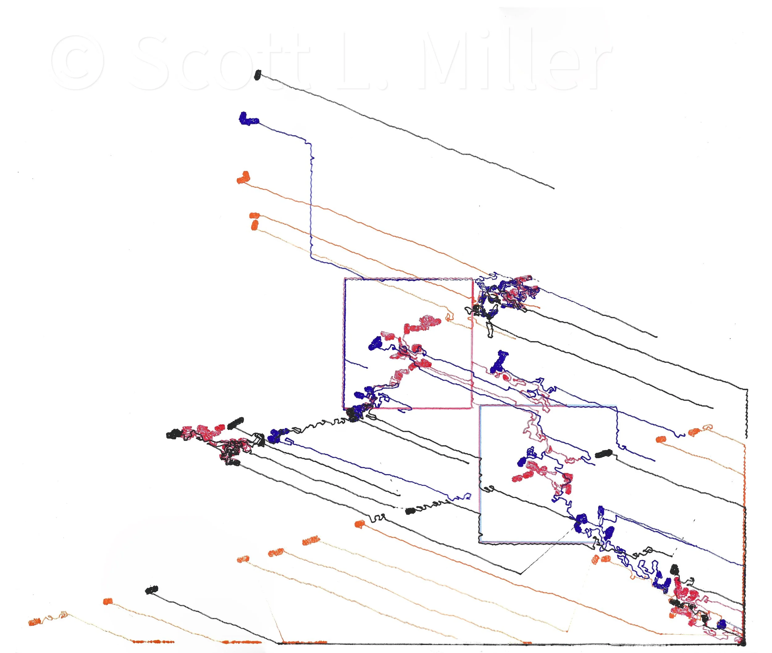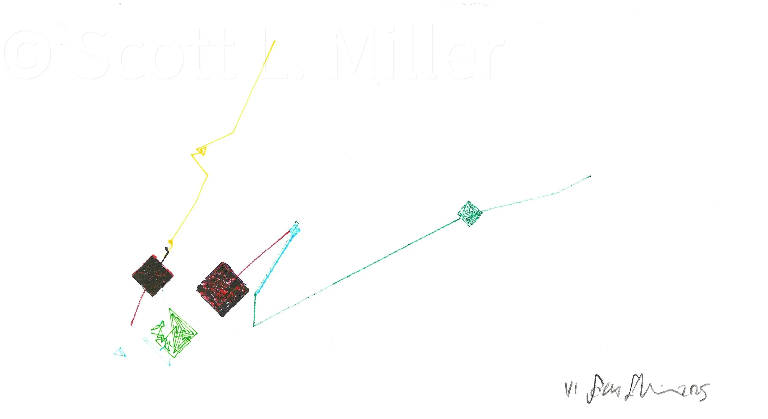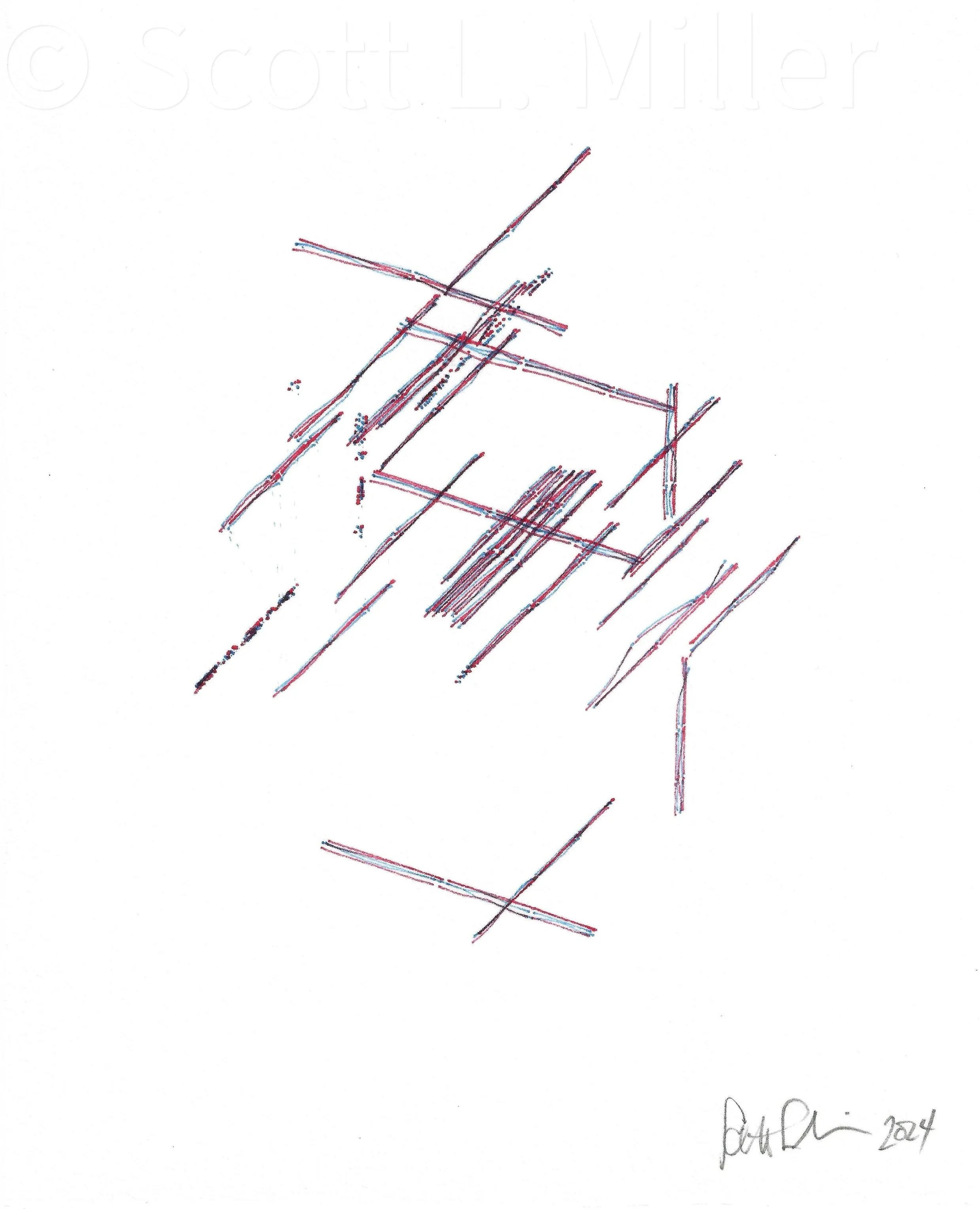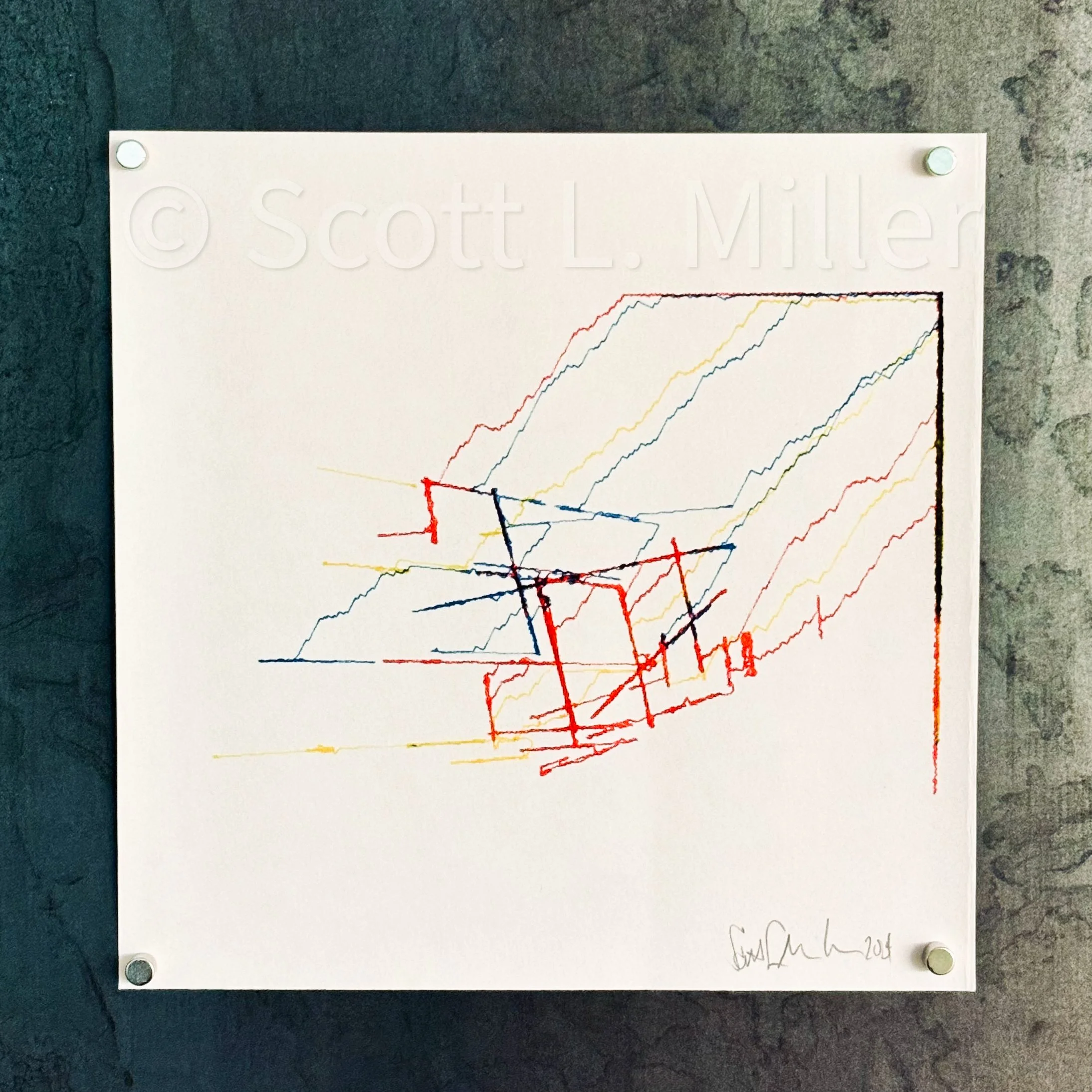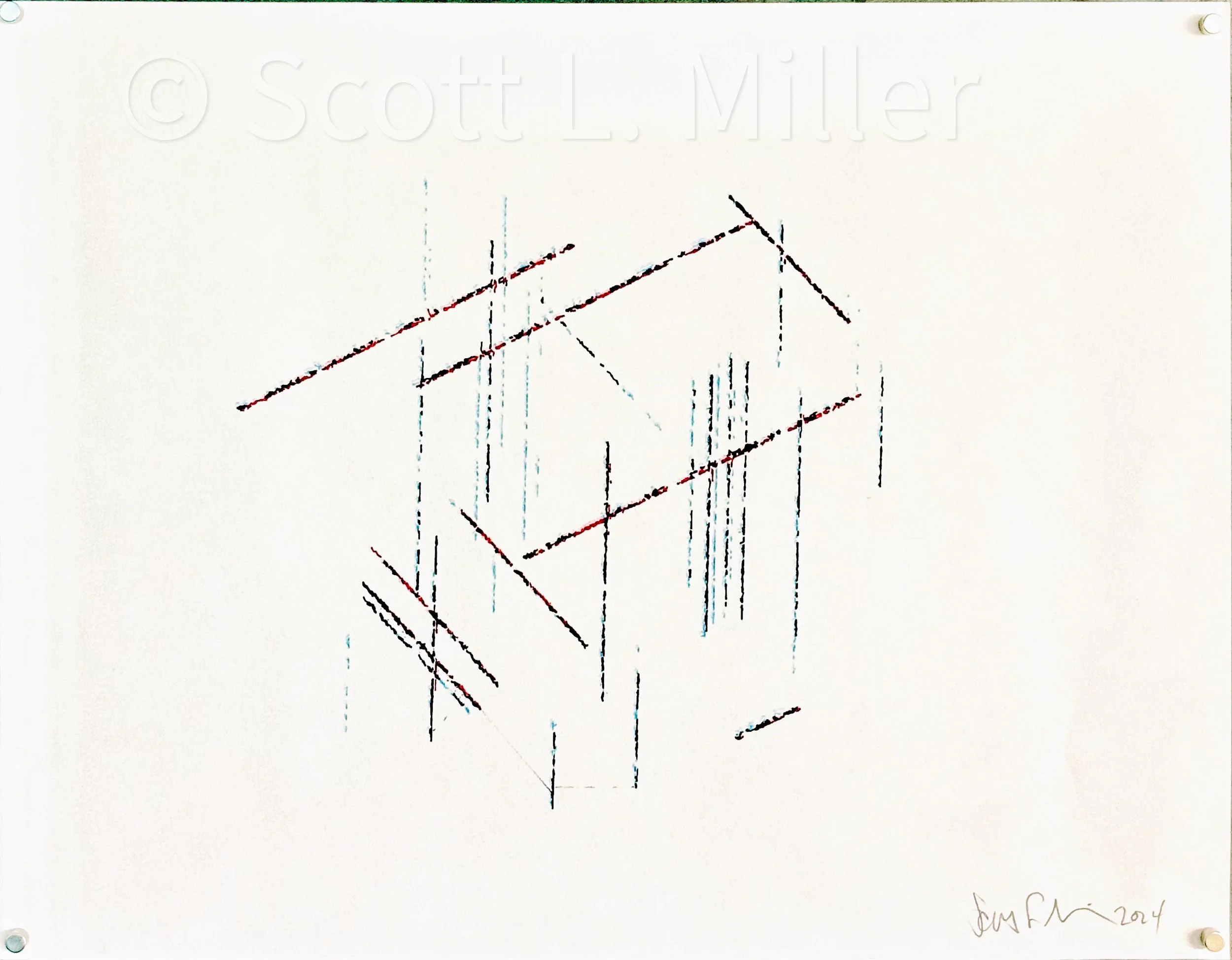 The “ground“ is the digital algorithmic process operating and the multiple iterations translating it; the “figure” is the surface that emerges from the ultimate physical and/or acoustic interpretation this translation. Translation—premiered by the percussion duo low pass in November 2025–is the most recent example. These are unique monoprint editions of the score and parts, produced with pen, pencil, and robotic drawing arm.