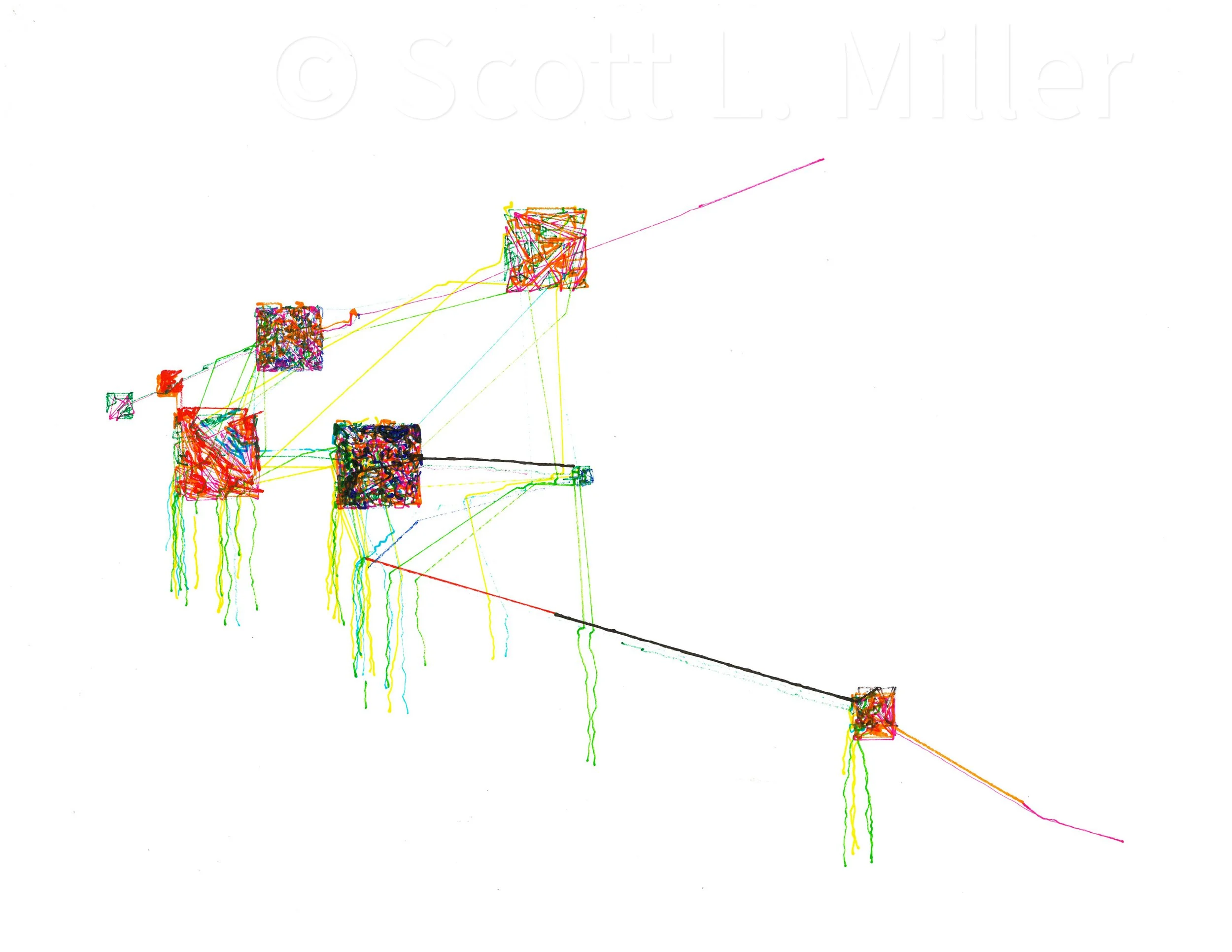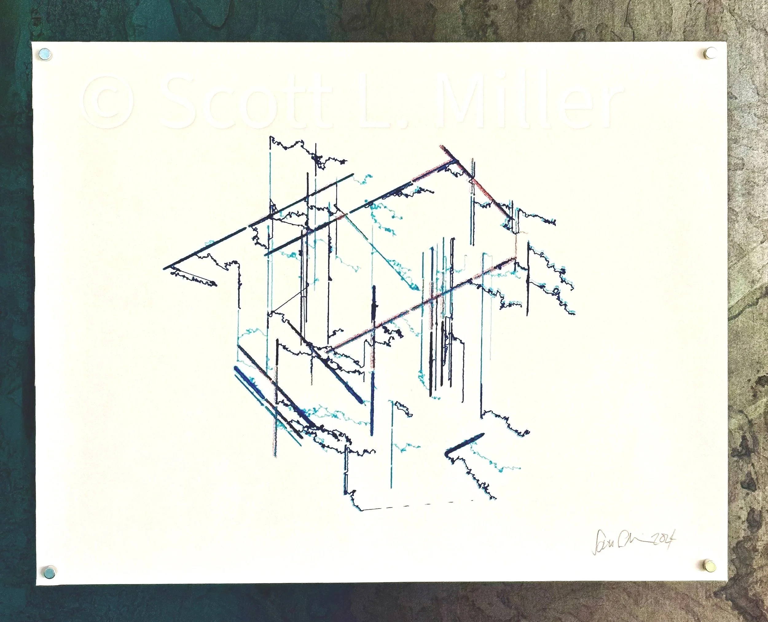 Elevation Studies and Exploded Diagrams are Figure and Ground adjacent works. These are not based on data generated during remote interactive electronic recording sessions but are monoprints created using pen, pencil, and robotic drawing arm.